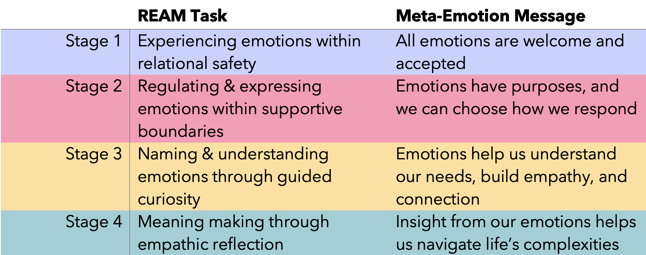 The REAM organizes emotional development into four core developmental tasks: